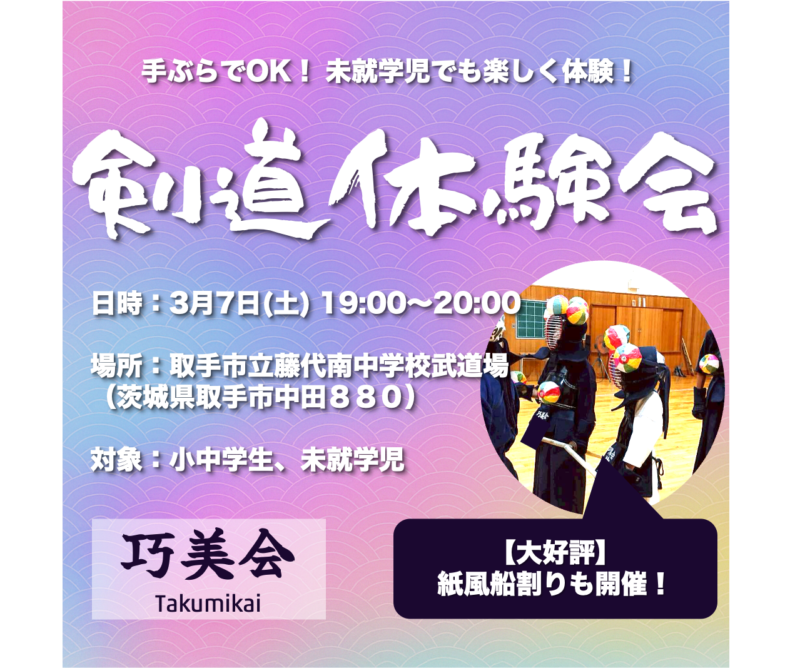 巧美会は、茨城県取手市で活動する、主に小学生と中学生を対象とした剣道道場です。